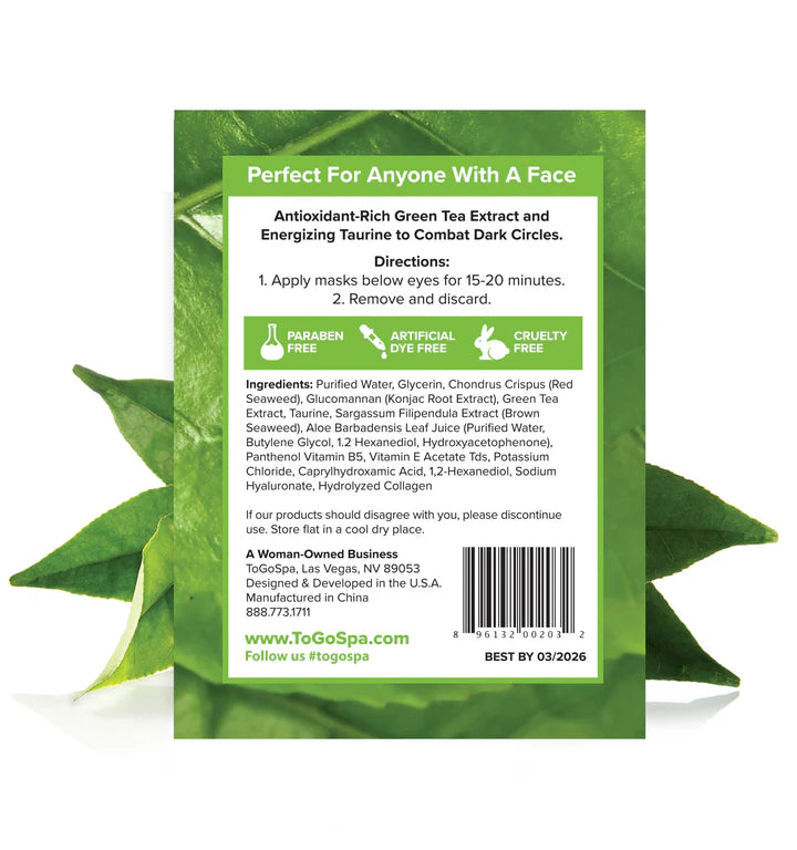 Micro-Infused Collagen Gel Masks with Hydrolyzed Collagen, Hyaluronic Acid, Aloe Vera, Vitamins C & E, antioxidant-rich Green Tea Extract and energizing Taurine to combat dark circles.