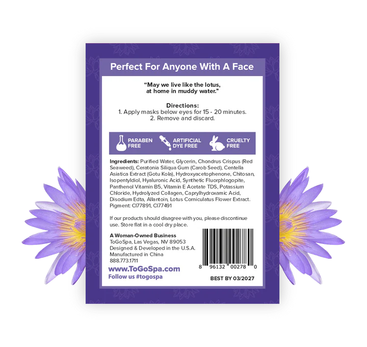 Rejuvenate your delicate under-eye area with the ToGoSpa Lotus Flower Eye Mask. Infused with natural lotus flower extract, this mask helps reduce dark circles, puffiness, and signs of fatigue, leaving your eyes looking brighter and refreshed. Its gentle formula is suitable for all skin types and delivers visible results in minutes.